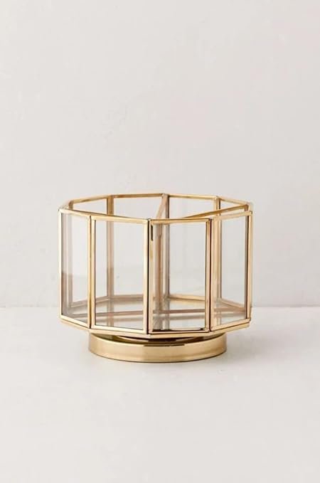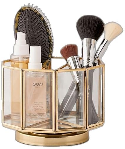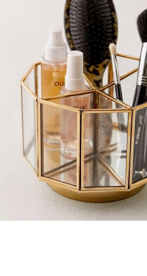 - ELEGANT DESIGN: Hexagonal glass organizer with gold metal frame and rotating base, perfect for displaying and organizing cosmetics and beauty tools